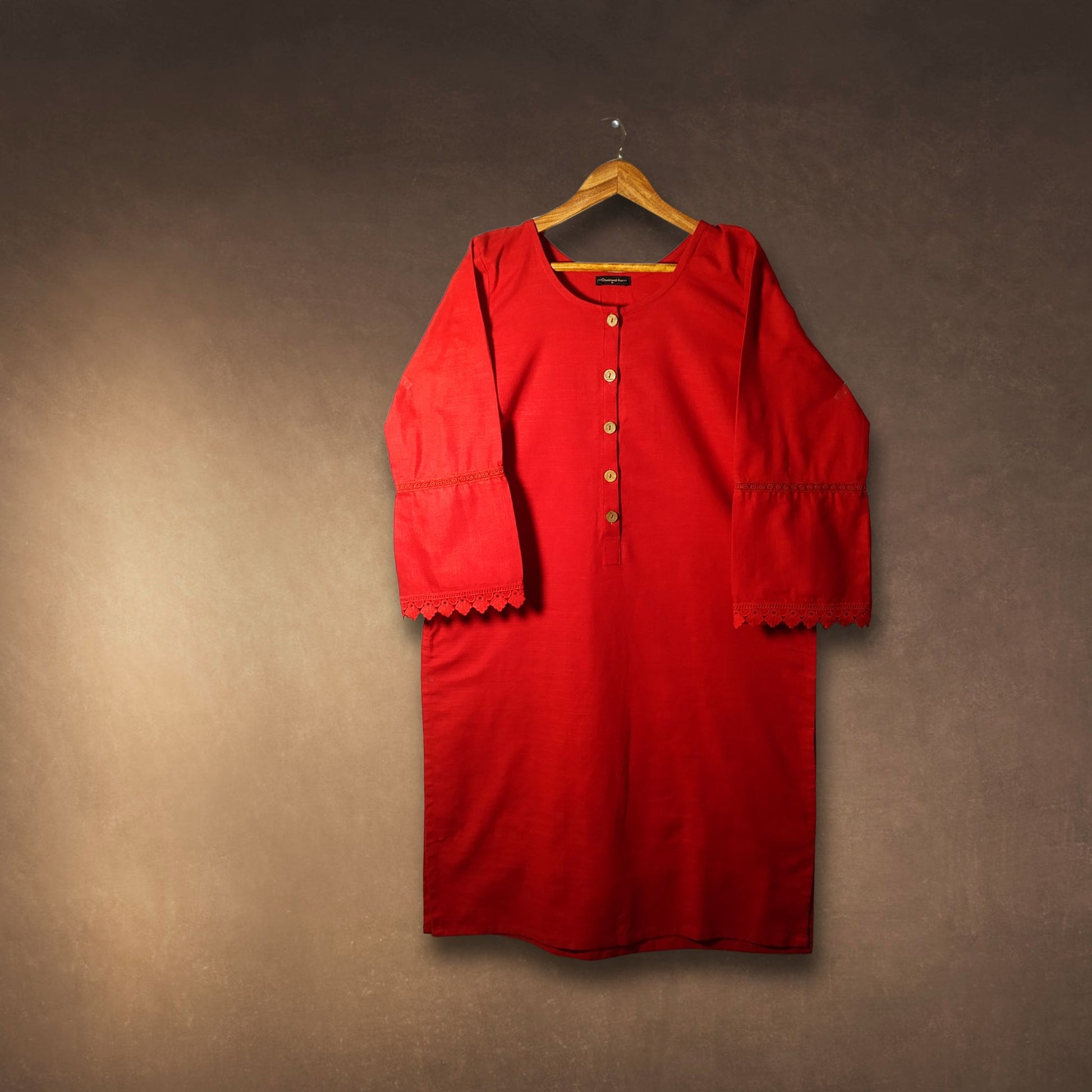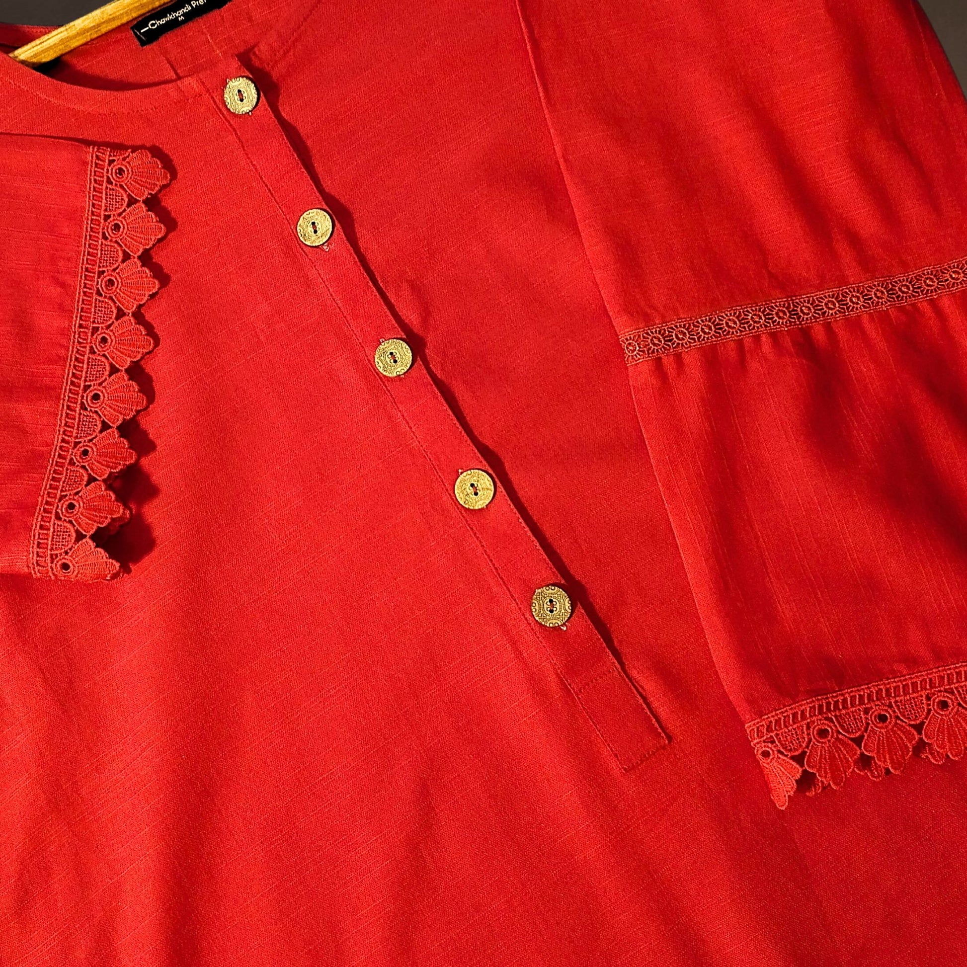 Kurta inspired round neck adorned with wooden buttons and double lace on sleeves.
